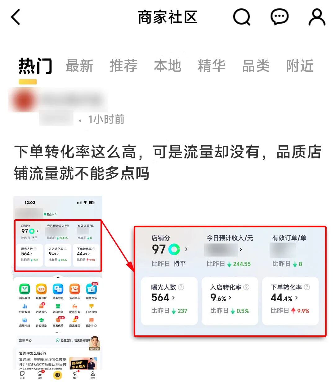 最近,有个商家在社区发帖,说自己的下单转化率挺高,但店铺流量不够。