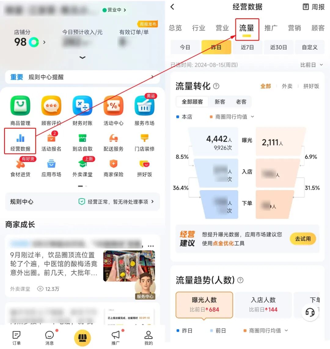 想要了解自己流量情况的老板,可以打开美团外卖商家版APP—【店铺页】—【经营数据】,选择【流量】,就能查看从曝光到进店、下单的留存和流失情况。