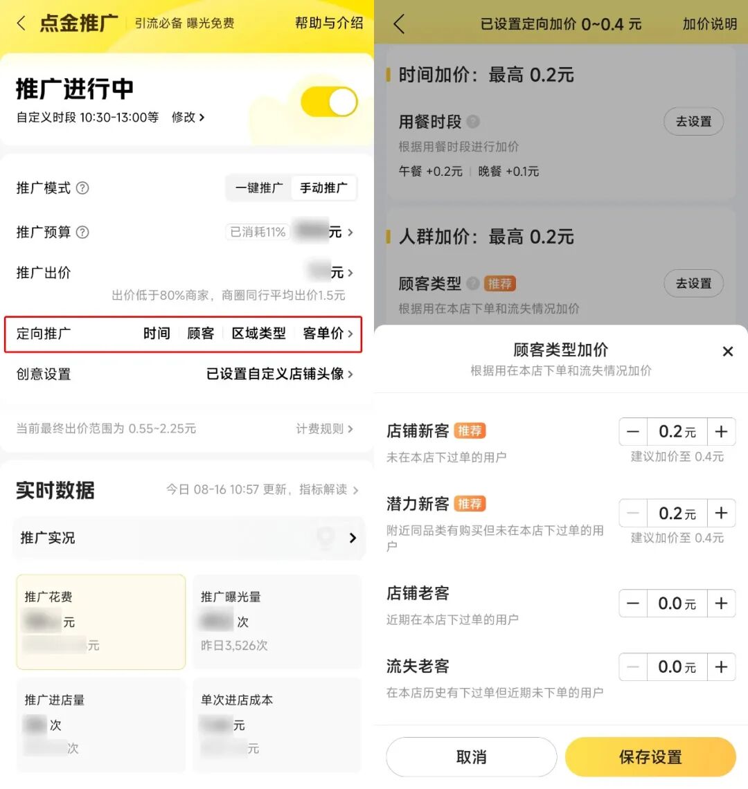 当然,搭配使用推广产品,曝光提升的效果会更快速明显。比如发帖的商家,很可能是新客占比较少,那可以在门店推广页面,开启【点金推广】,找到定向推广,在顾客类型里,针对【店铺新客】和【潜力新客】重点加价0.3元及以上,曝光就更精准。若商家是在高峰期抢不到流量,还可以试试【超级流量卡】,提前锁定列表第2或第6位,曝光多且稳定。